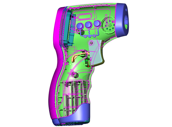体温枪外壳结构看起来并不是很复杂,体温枪组成确实有外部壳体及内部温度传感器、红外线精密探头、探头镜片、PCB板等元件构成,内部零件“藏身于”壳体内的各个部位中。体温枪外壳注塑精密程度,注塑材质手感的甚至比测试性能更加直接的影响客户购买决定。