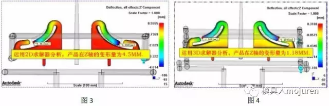 此产品用Moldflow 3D技术分析,也已经做了反变形,但实际试模出的产品仍有较大的变形。