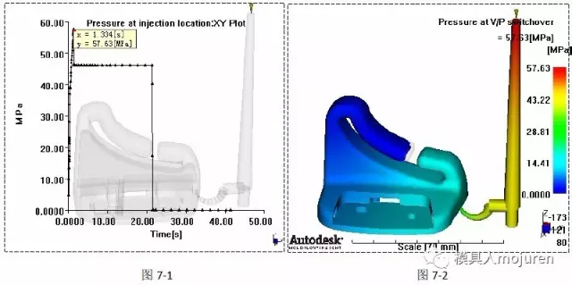 在制品填充的过程中压力最好不要太大,较大的压力会使压力很难均匀的传递到产品的各区域,很有可能造成薄壁区域的快速冷却,继而阻止后继压力的传递,形成蝴蝶效应。这种不良的效应破坏性相当大,会造成产品很多方面的缺陷。此产品喷嘴处的压力及转换时的压力,如下图7-1、7-2所示