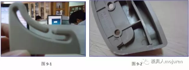 在这里制品仍做了1.2MM的反变形,浇口由原来的牛角进胶改为现在的大水口搭底进胶,分流道改为了S形,可防止主流道及分流道 的冷料进入模腔。实际的试模产品如图9-1、9-2所示,产品无变形