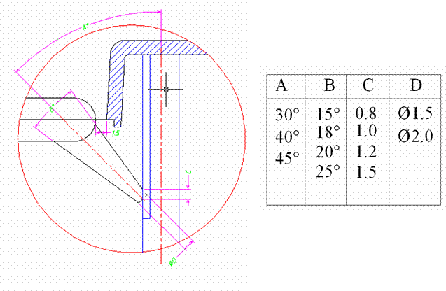 适用于大部塑料、各种侧边允许浇口痕迹的制品,开在制品的边缘或边缘顶面,又分标准入水、搭接入水和扇形入水,下图中t为产品壁厚,L一般为(0.8—1mm)